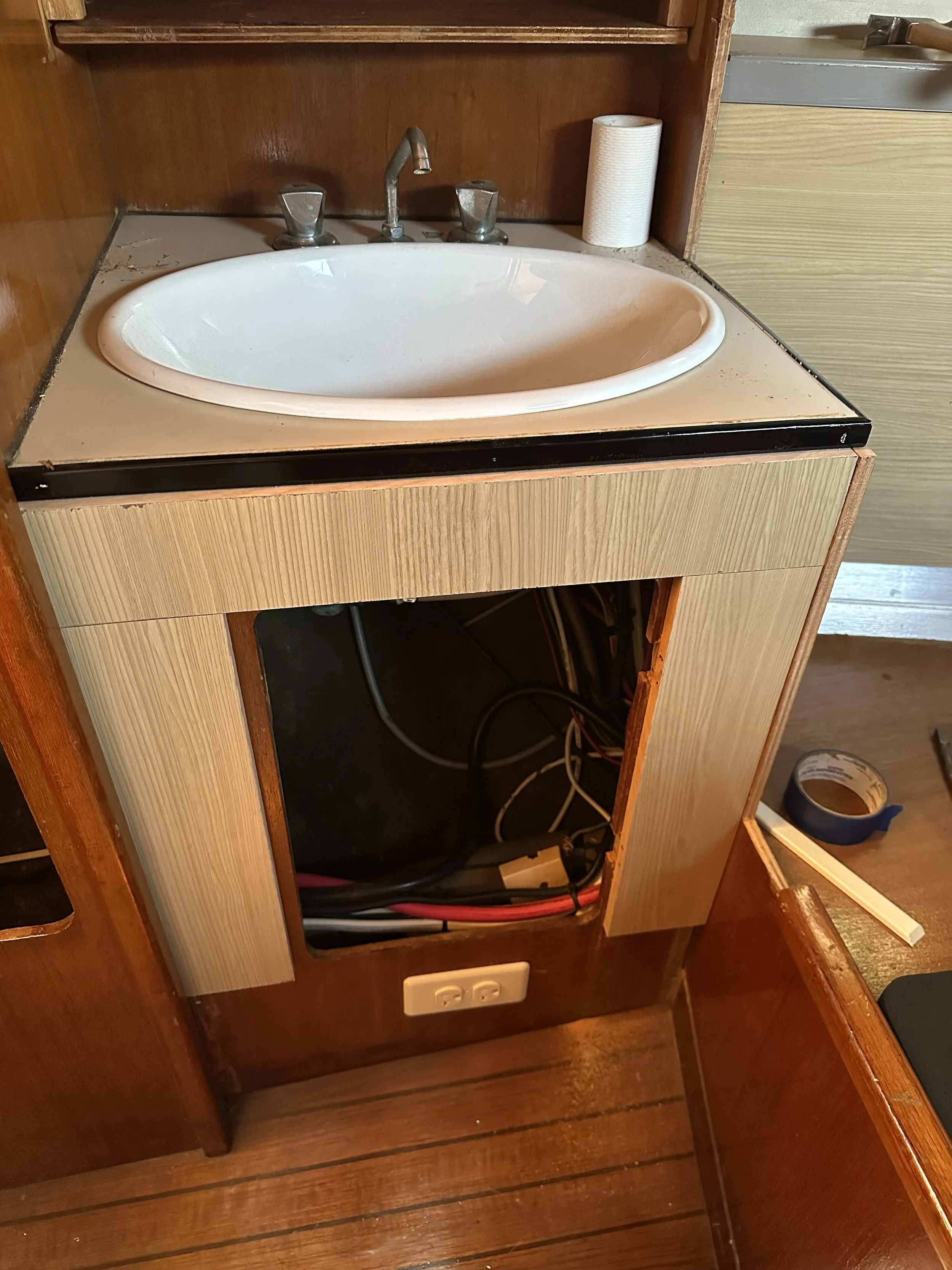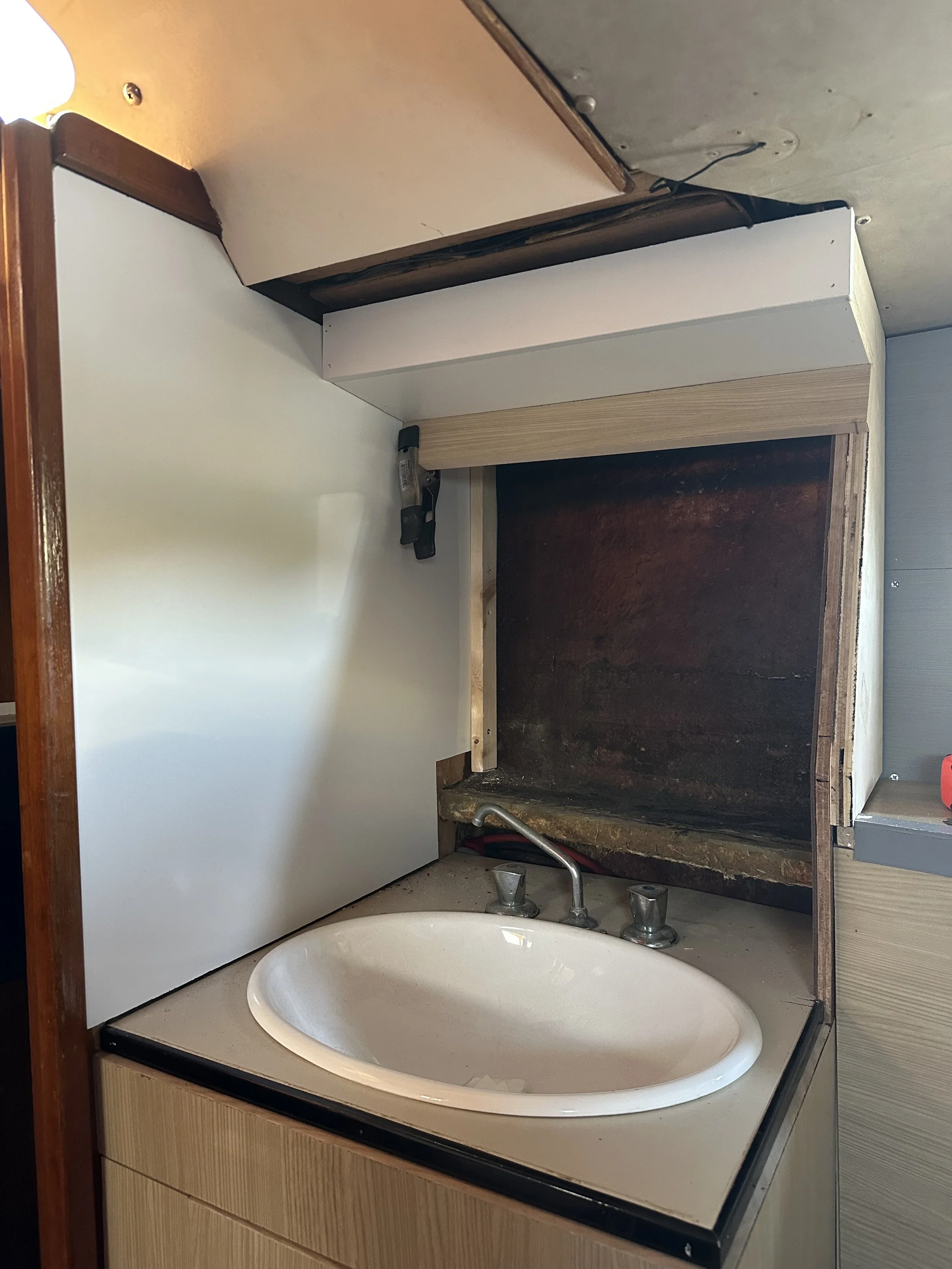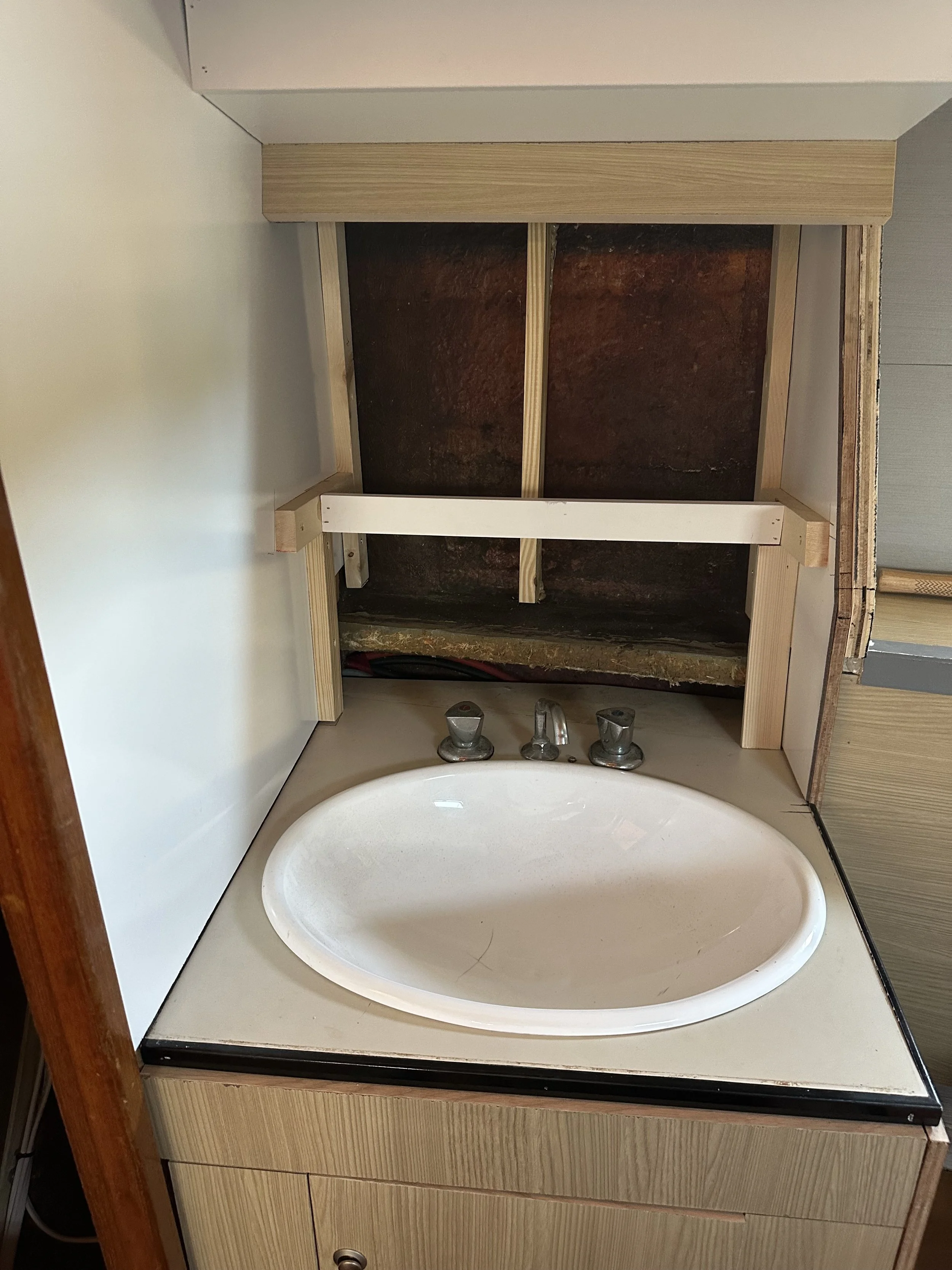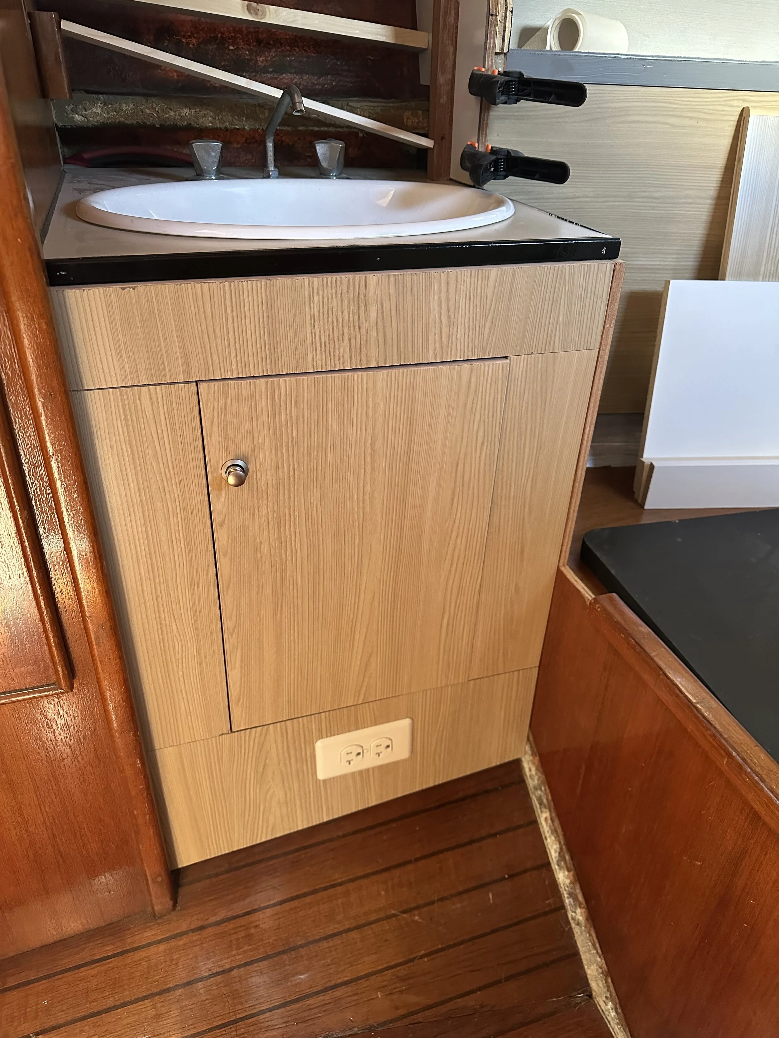 After determining which materials I would use, I began building out the side walls for the engine access hatch. I then built out the opposite side storage. So far, so good. Now came the challenge, the vanity. This would require a demo of the existing sink and cabinet first before I could start redesigning it into something a little more updated. Again, I had a rough idea of what I wanted it to look like, getting it to a more finished appearance turned out to be a little more challenging than expected.