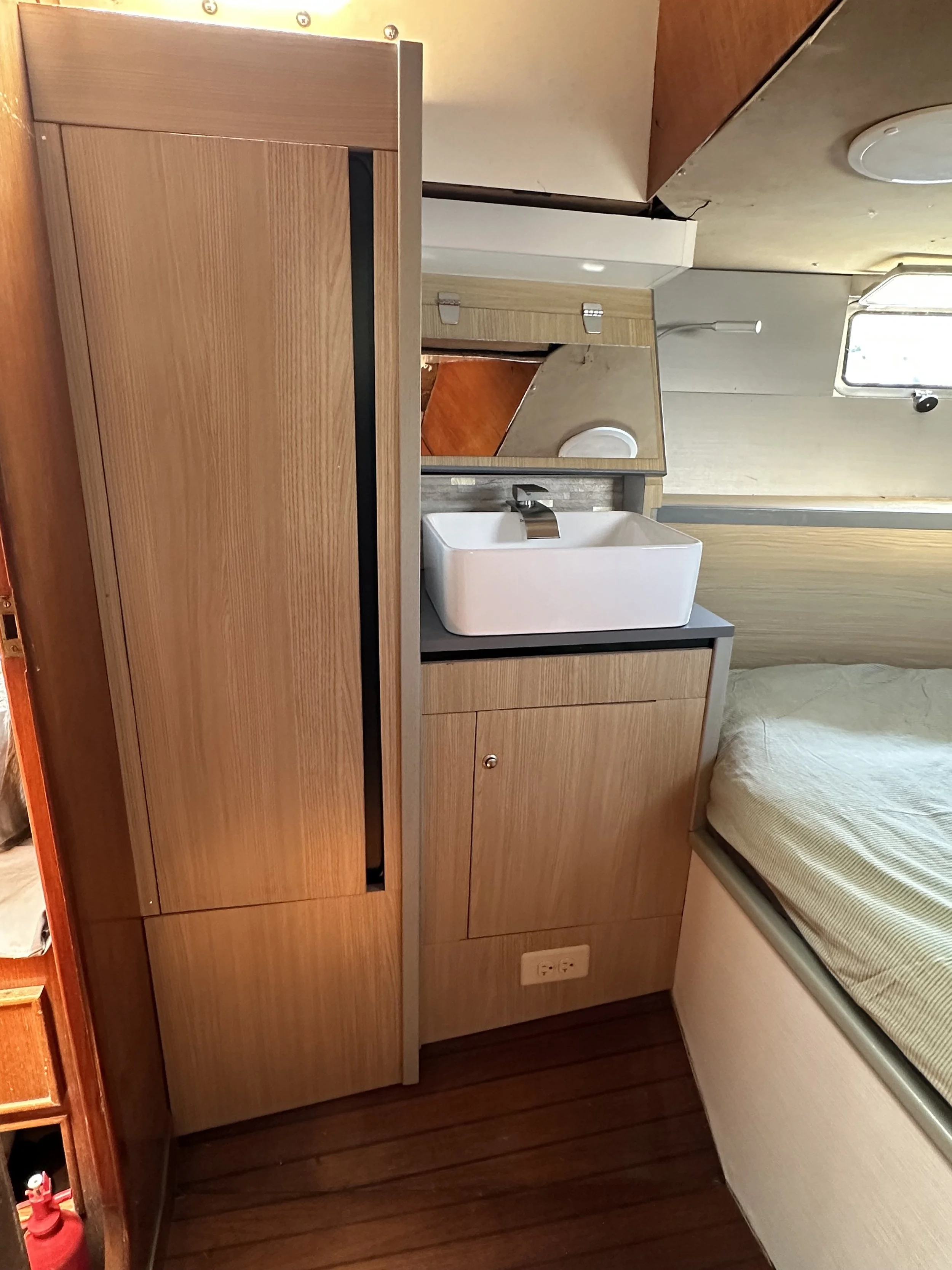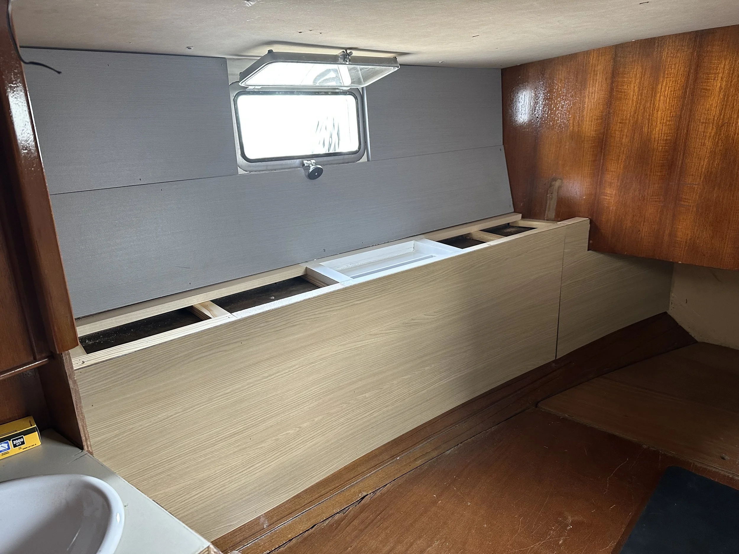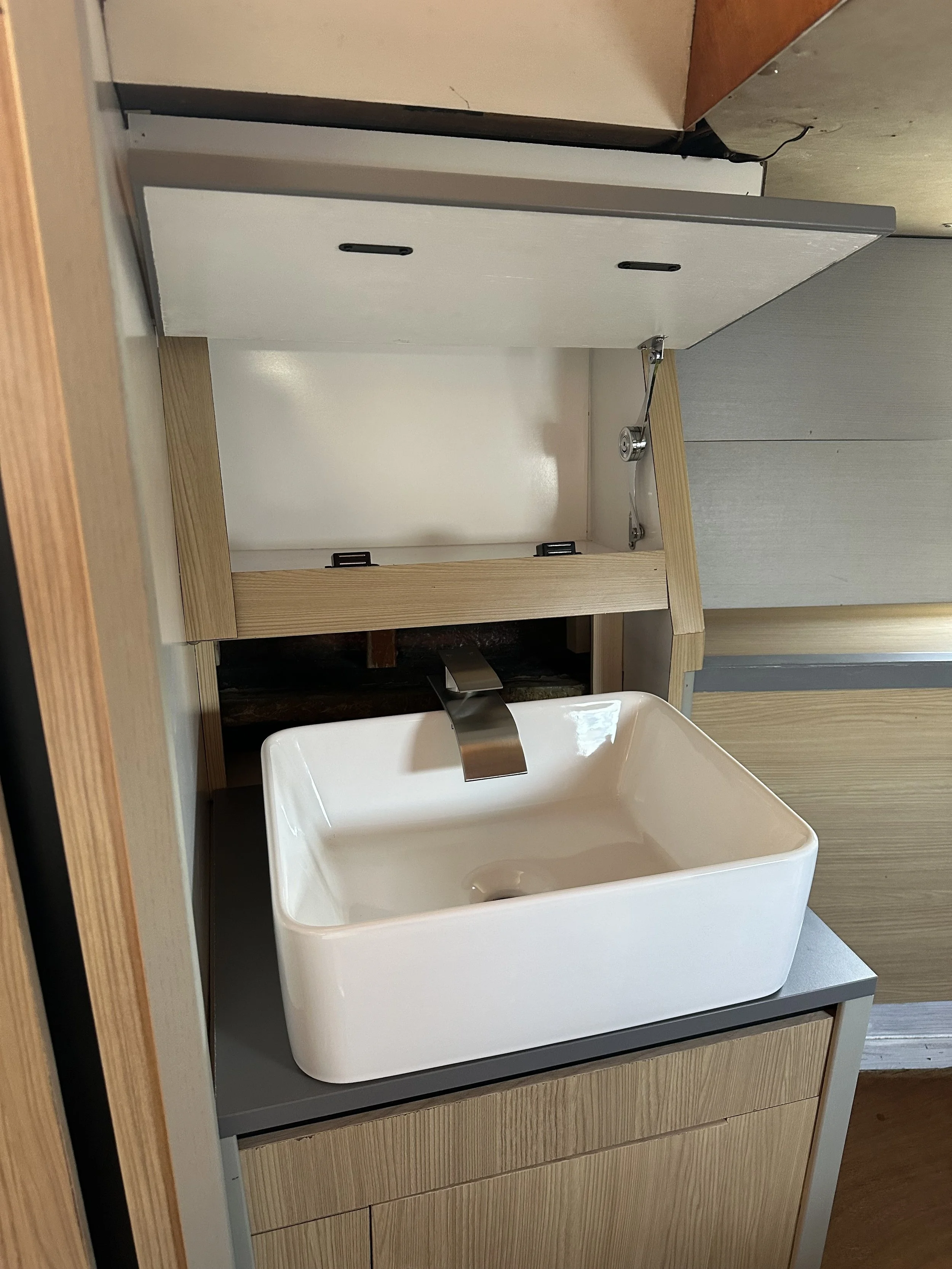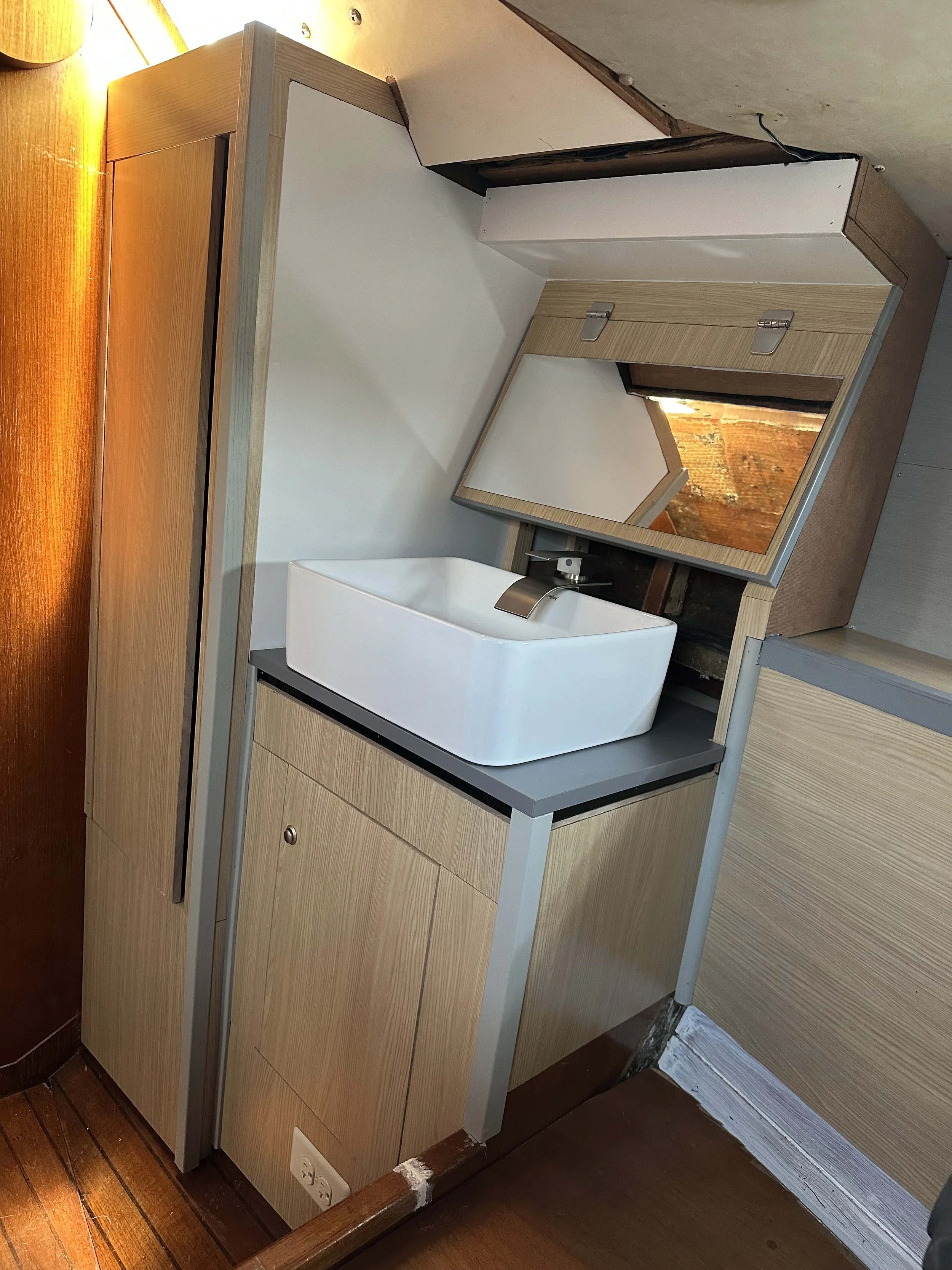 After determining which materials I would use, I began building out the side walls for the engine access hatch. I then built out the opposite side storage. So far, so good. Now came the challenge, the vanity. This would require a demo of the existing sink and cabinet first before I could start redesigning it into something a little more updated. Again, I had a rough idea of what I wanted it to look like, getting it to a more finished appearance turned out to be a little more challenging than expected.