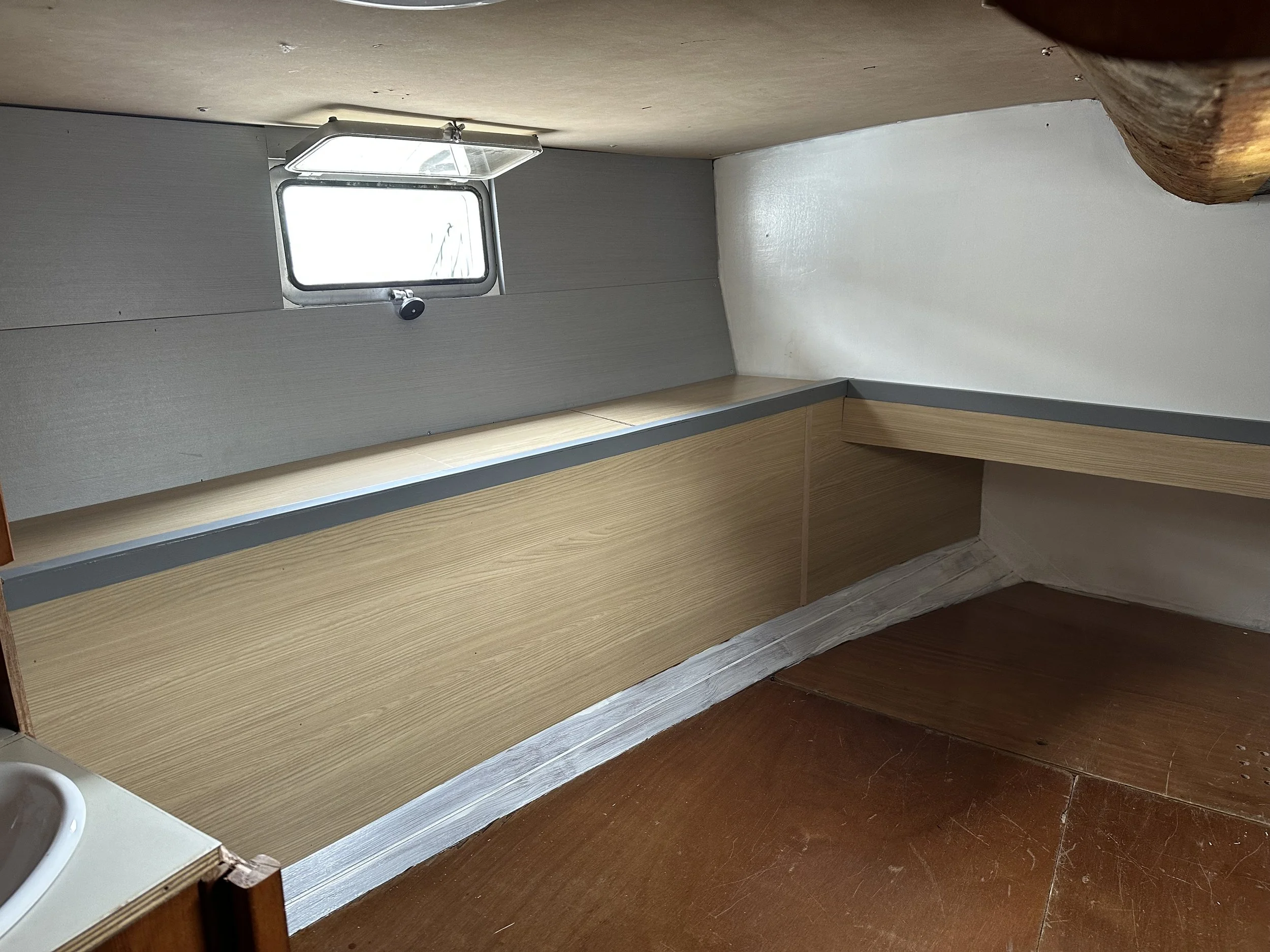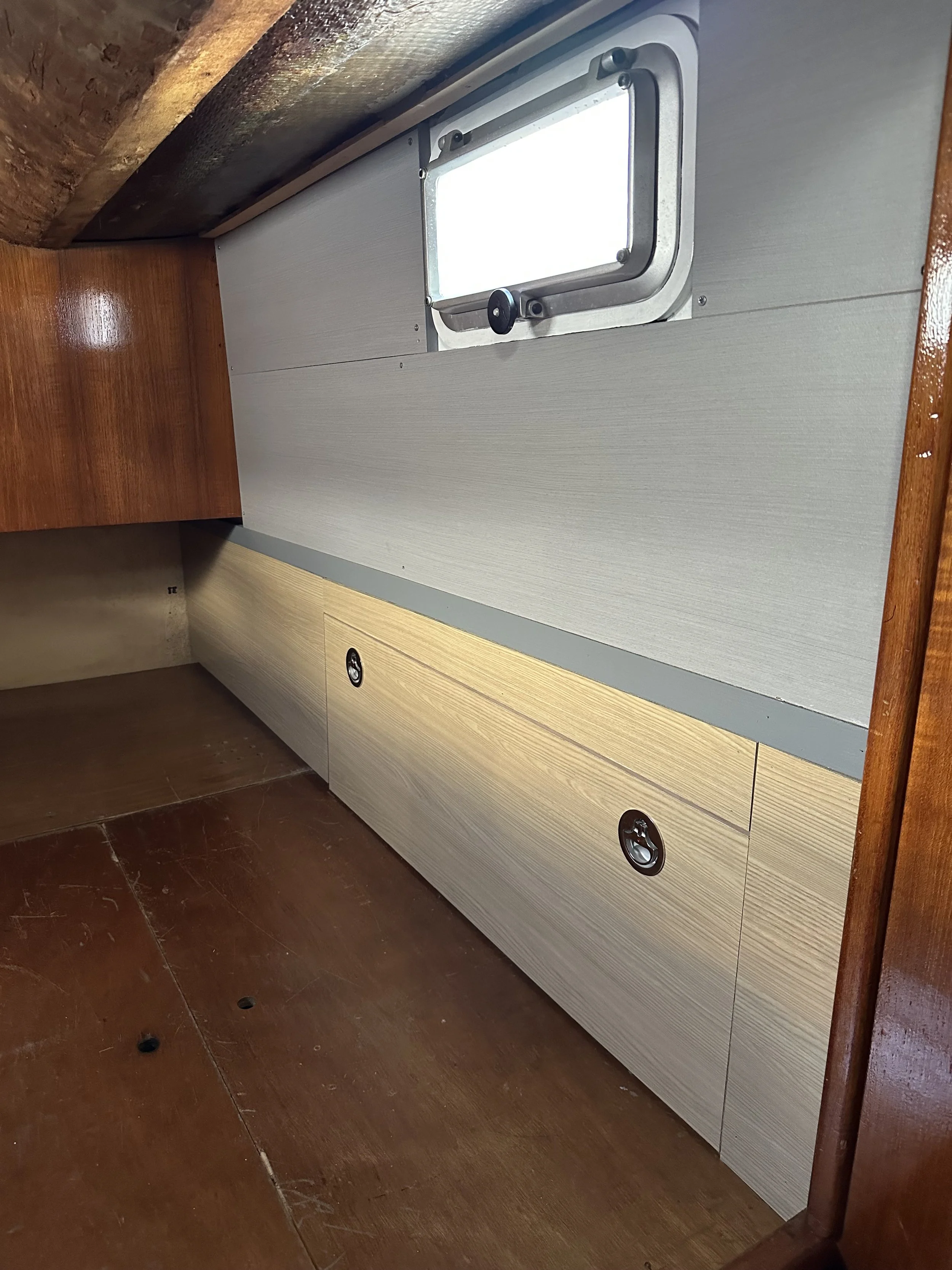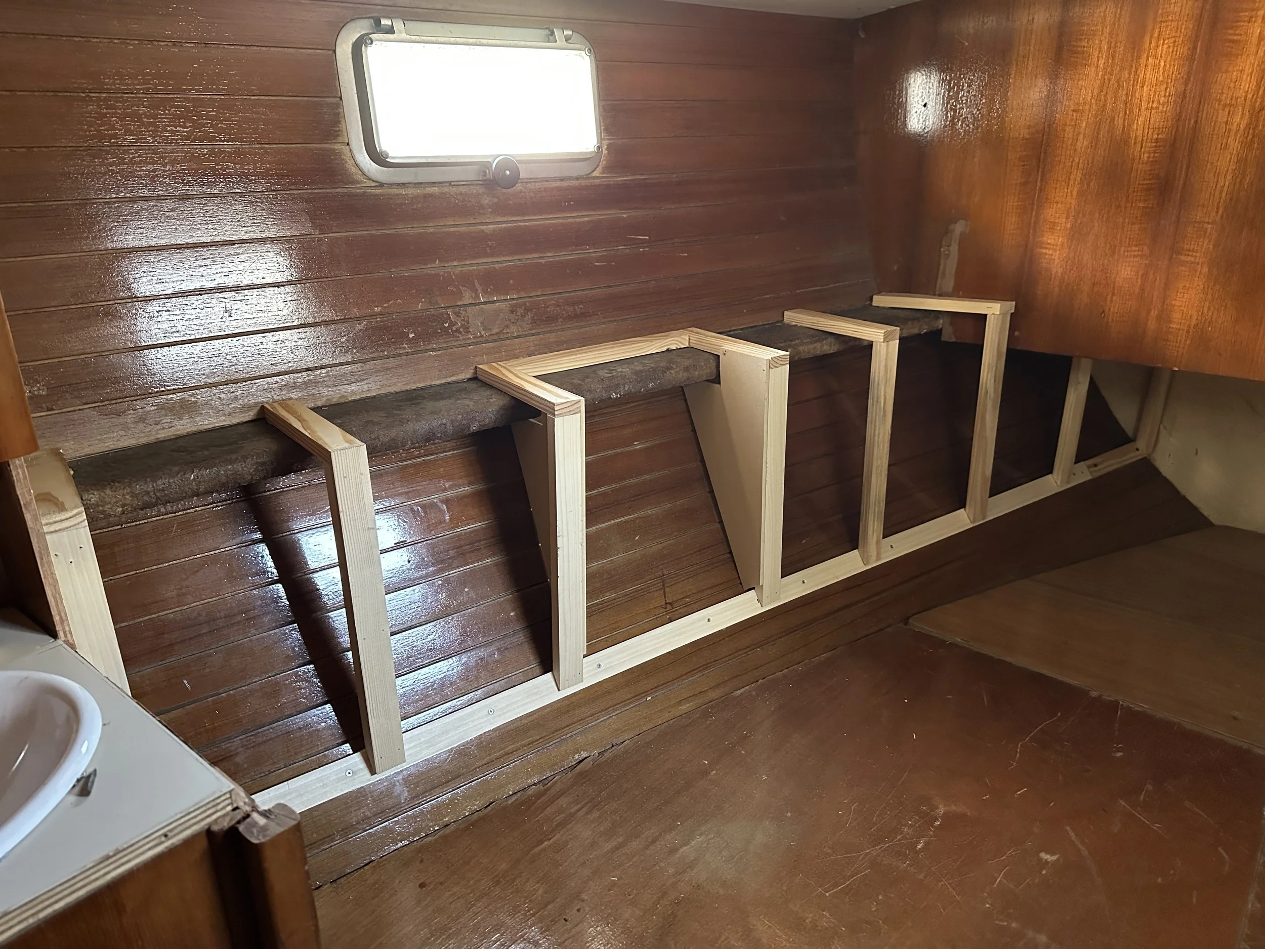 After having minimal success with the aft head, I took my chances and begun work on the port-side, aft cabin. I know professionals would have drawn up plans with precise measurements, which is a very logical approach to a boat interior redesign. Unfortunately that’s not how my brain works. I’m a design as you go, kind of have an idea, hope for the best, person. Which, as a designer, allows for a more evolutionary process. I’m betting this may not work out as well in construction, but let’s see where it goes.